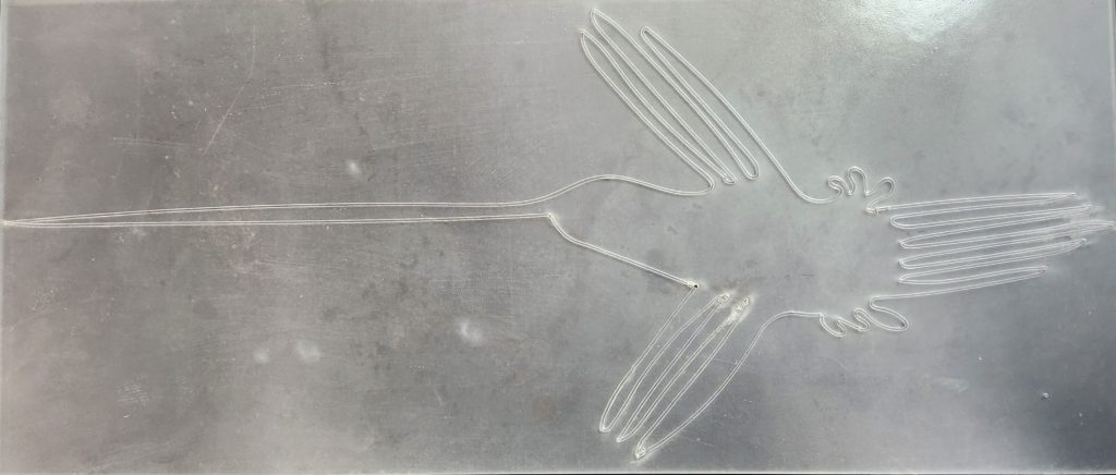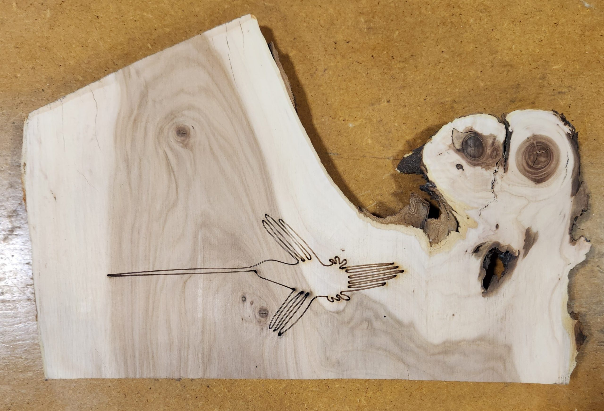 Line drawings in the desert sands from pre-colonial Peru were the inspiration for this hummingbird. Drawn by Eli and laser etched by Steve and Eli. This project is a combination of artwork from 2000 years ago and 21st century technology.